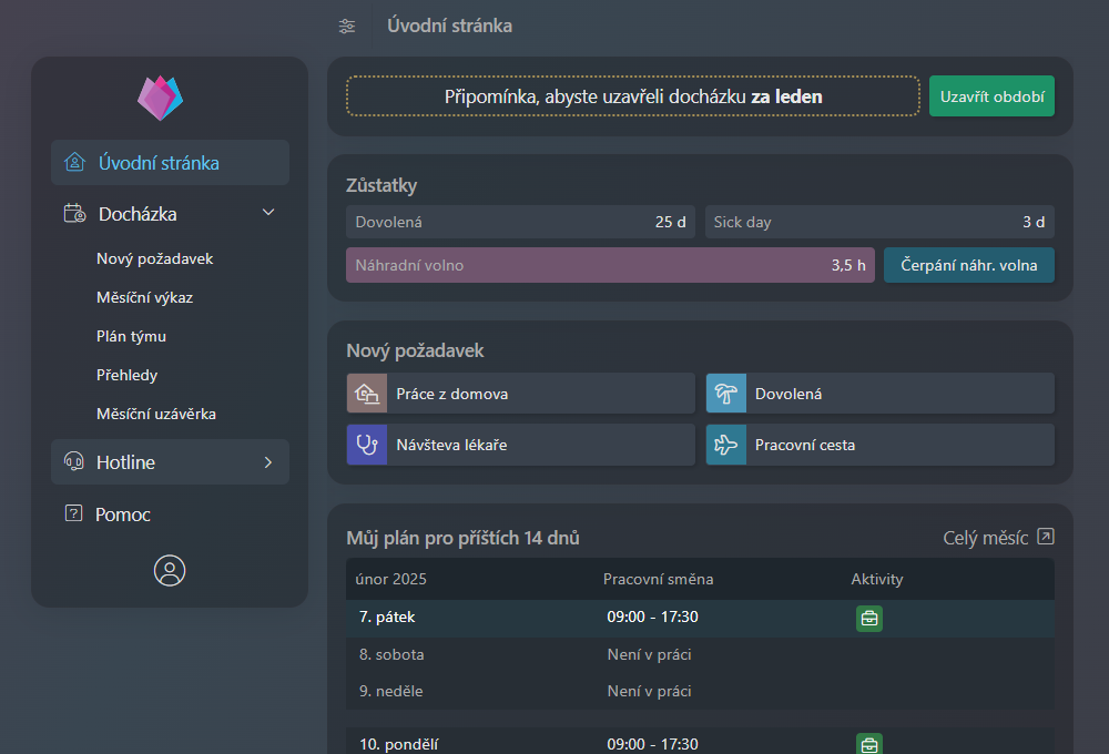 TULIP HERON je docházkový systém k evidenci pracovní doby a absencí provozovaný v cloudu. Aplikace je vybudovaná na HAVIT Blazor stacku a naše role při vývoji aplikace (dodavatelem a provozovatelem aplikace je TULIP Solutions, s.r.o.) spočívala v konzultacích a spolupráci na náročnějších částech implementace.
